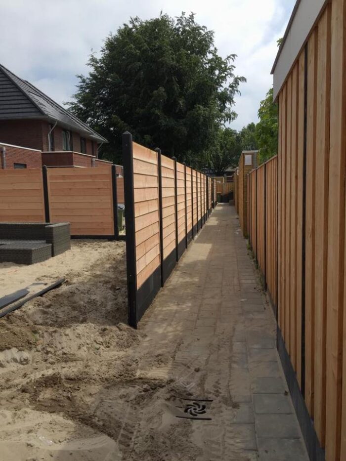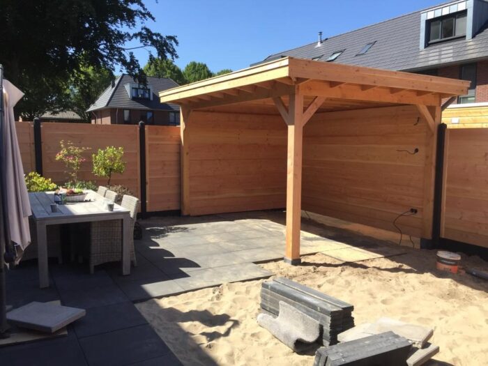 - WAT?57 meter antraciet gecoat beton + douglas zweeds rabat schutting + douglas veranda 3x4 meter