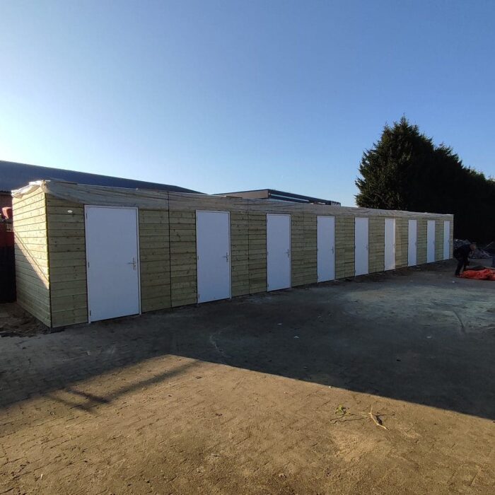 Voor de gevelbekleding hebben we gekozen voor vuren rabat. Vurenhout is één van de meest gebruikte houtsoorten in Nederland, wordt altijd geïmpregneerd voor een langere levensduur. De daken van de schuren zijn vakkundig afgewerkt met bitumineuze dakbedekking. Dit type dakleer is ideaal voor platte daken zoals schuren. Op deze manier zijn de opslagruimtes waterdicht afgedekt waardoor spullen veilig kunnen worden opgeborgen. Voor extra gemoedsrust zijn alle deuren uitgerust met een 3-puntssluiting, waarbij de deur met één slot op drie vergrendelpunten wordt gesloten.