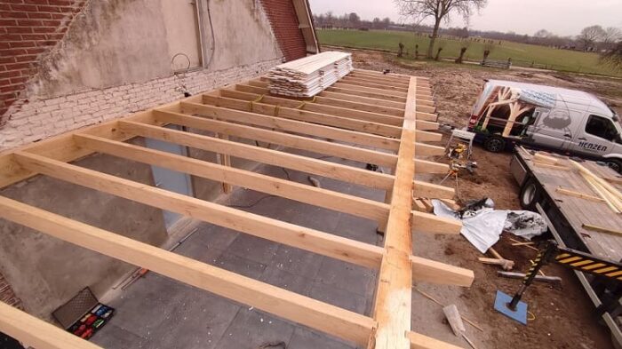 We begonnen het project met het plaatsen van de palen en balken tegen de gevel van het huis. We hebben hiervoor gebruik gemaakt van eiken palen op betonpoeren en eiken ringbalken. De palen en balken dienen als constructie en zijn daarmee de basis van de veranda.