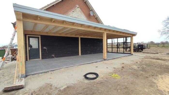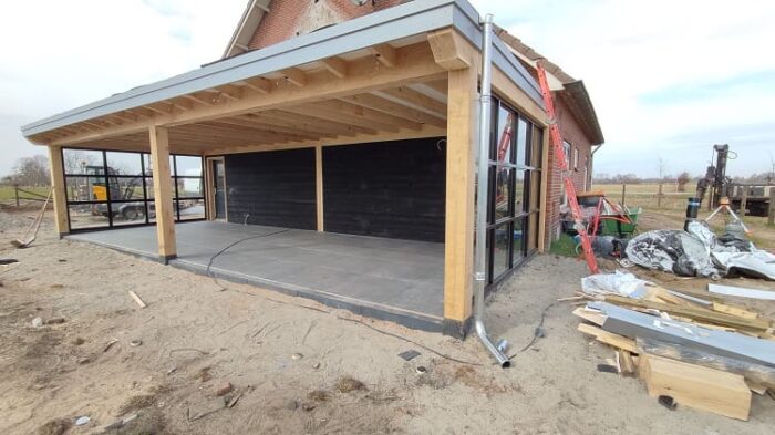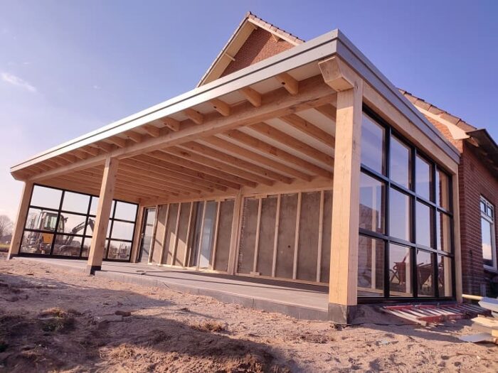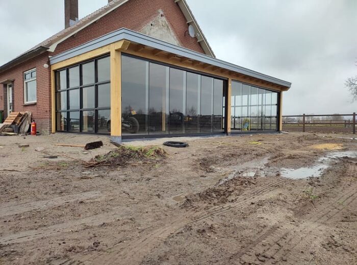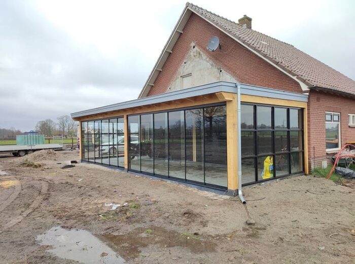 Na het neerzetten van de constructie konden we verder aan de slag met de vormgeving van de veranda. Een belangrijke blikvanger van de veranda zijn de vele glazen wanden die een mooie lichte plek creëren, hierdoor lijkt het net alsof u buiten zit. Aan ze zijkant hebben we vaste glazen puien geplaatst met een mat zwart frame. Aan de voorzijde zijn twee glazen schuifwanden geplaatst, eveneens met een mat zwart frame.