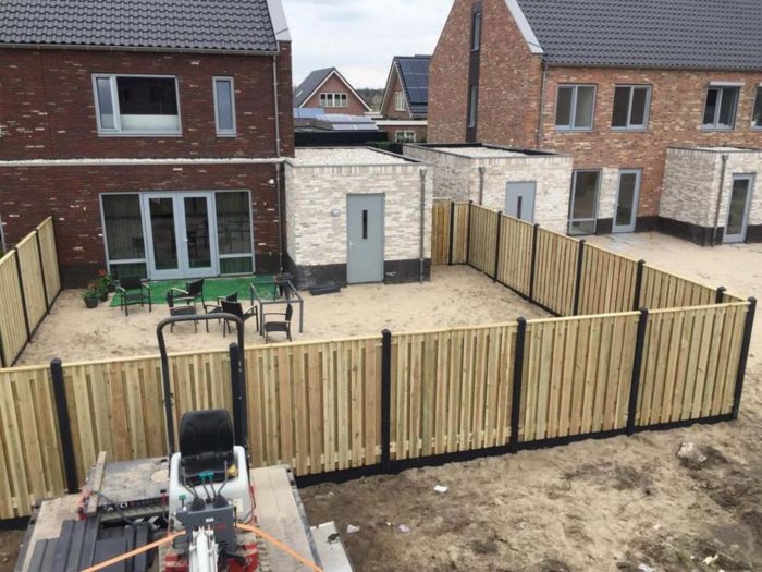 - WAT?45 meter + 1 poortdeur met grenen 21 planks schutting en antraciet gecoat beton.