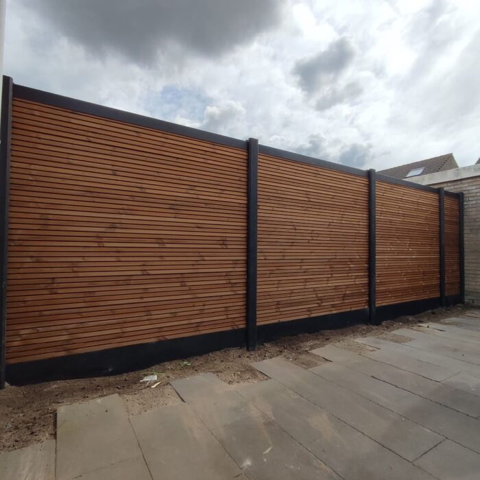 De meeste schuttingen die wij plaatsen bestaan uit de zogenoemde beton-hout combinatie. Door het gebruik van betonnen palen en platen, vermijden we direct contract van het hout met de grond, wat de levensduur van de schutting verlengd door rotting van het hout tegen te gaan. Het contrast tussen het natuurlijke hout en de antracietgekleurde betonpalen geeft daarnaast een strakke uitstraling. De betonpalen zijn zogenoemde sleufpalen, waardoor de schuttingplanken strak tussen de palen gemonteerd kunnen worden. De bovenzijde van de schutting is afgewerkt met een gepoedercoate u-profiel afdeklijst. Dit beschermt de bovenzijde van het hout en past qua afwerking perfect bij het gecoate beton.